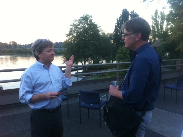 This year’s event had many highlights, including excellent talks from our students and postdocs representing a broad range of research from theoretical network modeling to neural control of flight to cochlear implant design. Clay Reid of the Allen Institute gave a brief overview of the Mindscape project and went into detail on his recent studies examining the detailed connectivity patterns of specific cell types in cortex. New faculty member Emily Fox discussed her advances in statistical modeling of EEG data. Cris Niell, of U. Oregon, described LGN responses in awake behaving rodents and noted a surprising response type, a neuron that is completely silenced by any contrast in its visual field. Perhaps most dramatically, Emo Todorov closed the day by showing astonishing examples where principles of optimal motor control combined with constraints on surface contacts can predict and model remarkably lifelike human motor behavior.